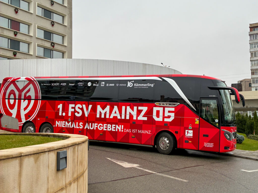Der Weg vom Bahnhof zum Hotel führte mich zwei Kilometer weit an grauen Plattenbauten entlang. Auf grauen Straßen und bei grauem Himmel erreichte ich das einzig großen Hotel der Stadt. Dort erstrahlte in herrlichem Rot-Weiß der Bus von Mainz 05. Dieser musste durch halb Europa hierher gurken. Schließlich kann das Team vom Flughafen ins Hotel und von dort ins Stadion nur in diesem Bus fahren. Gewohnte Abläufe…so wichtig im Profifußball.